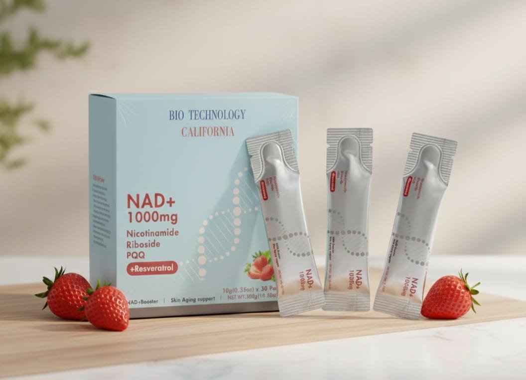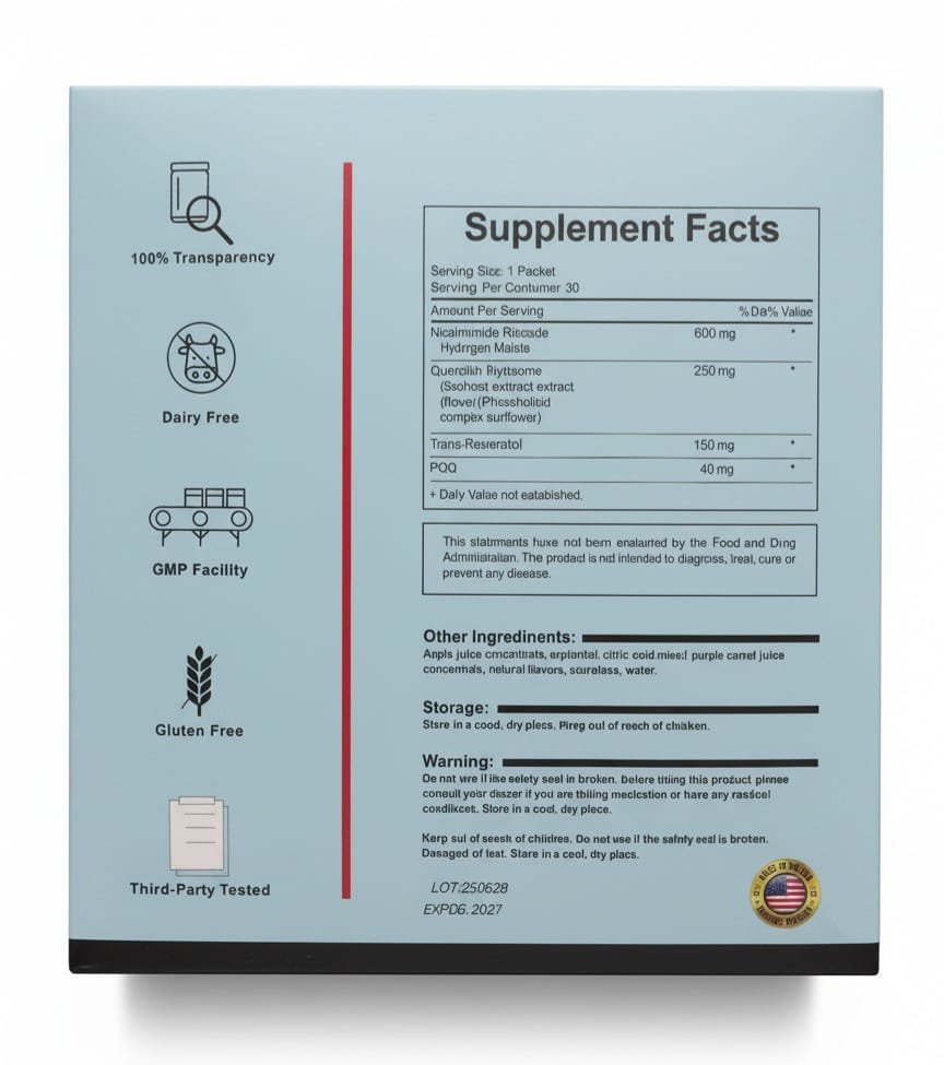 - Peau plus jeune : Les actions antioxydantes du Resvératrol et le soutien à la régénération cellulaire du NAD+ peuvent contribuer à retarder le vieillissement cutané, soutenant l’éclat et la protection de la peau.